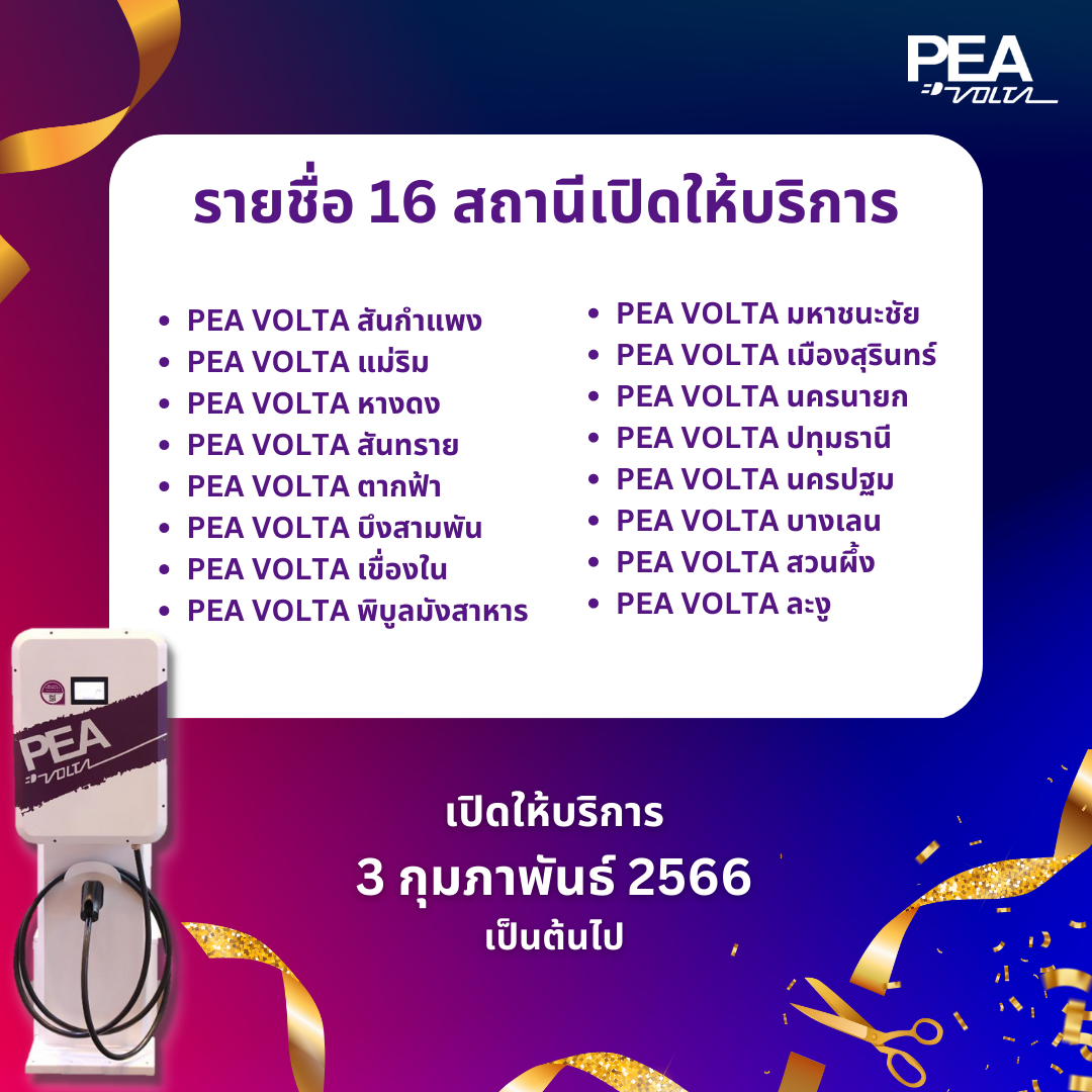 สำหรับการขยายสถานีชาร์จ PEA VOLTA ล่าสุดได้มีการเปิดให้บริการสถานีเครื่องอัดประจุไฟฟ้ากระแสตรงขนาด 25 kW “VOLTA DC25” ต้นปีนี้จำนวน 16 สถานี โดยเปิดให้บริการไปแล้วในพื้นที่ต่างจัดหวัด เมื่อวันที่ 3 กุมภาพันธ์ 2566 ประกอบด้วย PEA VOLTA สันกำแพง แม่ริม หางดง สันทราย ตากฟ้า บึงสามพัน เขื่องใน พิบูลมังสาหาร มหาชนะชัย เมืองสุรินทร์ นครนายก ปทุมธานี นครปฐม บางเลน สวนผึ้ง ละงู ทำให้ล่าสุดมีสถานีชาร์จขนาด 25 kW W ให้บริการแล้วทั้งสิ้น 118 สถานี