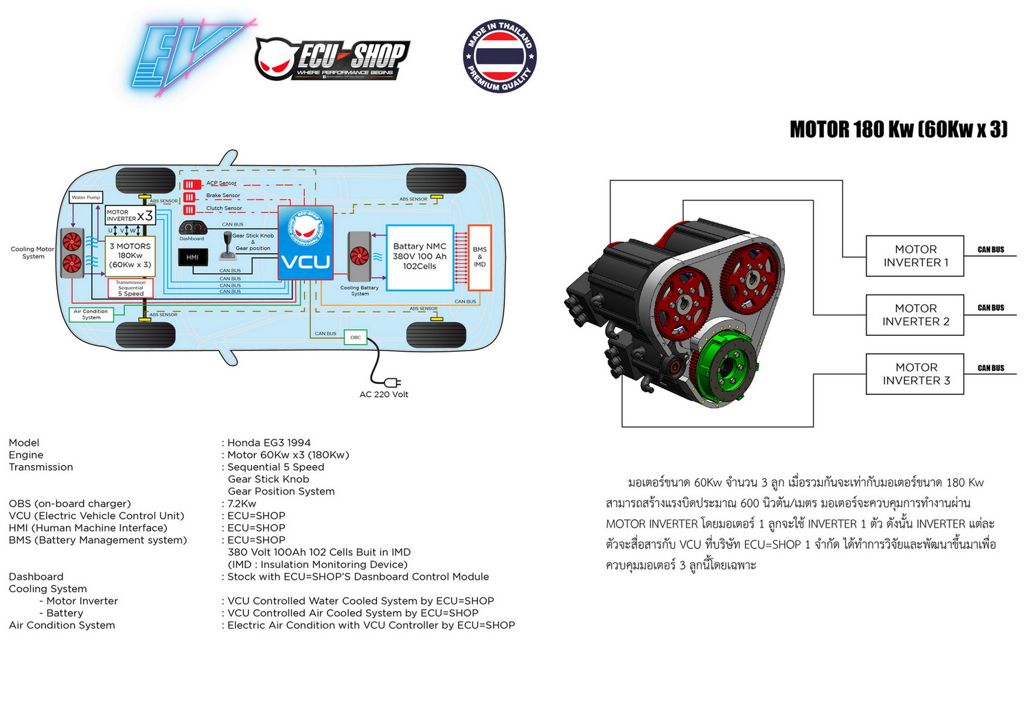 “บริษัทเราสร้างระบบคอนโทรลทุกอย่างเอง การทำรถเลือกใช้มอเตอร์ 3 ลูก เพราะให้โปรแกรมเมอร์ออกแบบกล่องคอนโทรลให้สามารถคุยกับระบบมอเตอร์ได้ 3 ลูกพร้อมกัน รถดัดแปลงคันนี้ทำขึ้นมาเพื่อการวิจัย ในอนาคตอาจจะทำแบบมอเตอร์ 4 ลูก สำหรับล้อทั้งสี่ล้อแยกออกจากกัน” ทีมงาน ECU=SHOP EV เล่าถึงการดัดแปลงรถไฟฟ้าคันนี้ พร้อมกับอธิบายเพิ่มเติมว่า...