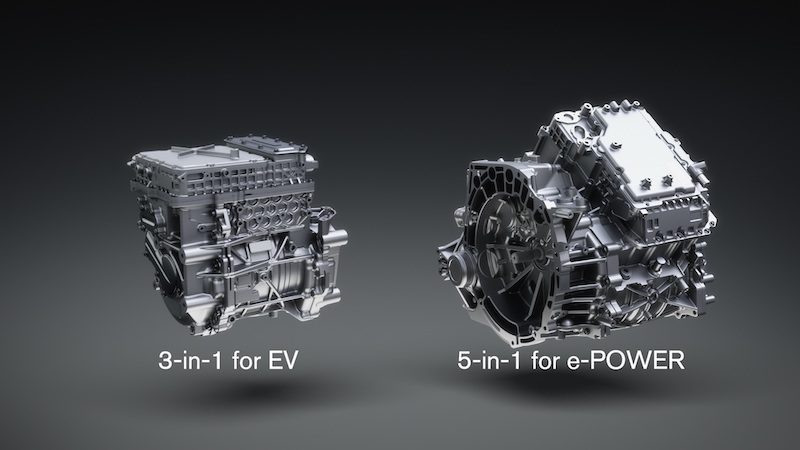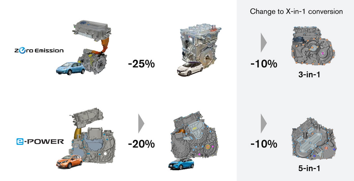 แนวคิด X-in-1 “Next-generation X-in-1 electric powertrain” คือการเพิ่มขีดความสามารถในการแข่งขันของรถยนต์ EV และ e-POWER นิสสันได้พัฒนาระบบขับเคลื่อนต้นแบบ 3-in-1 โดยปรับมอเตอร์ อินเวอร์เตอร์ และตัวลดขนาด (reducer) ให้เป็นโมดูล ถูกวางแผนไว้สำหรับใช้ในรถยนต์ระบบขับเคลื่อนแบบ full EVs ขณะที่ระบบขับเคลื่อนต้นแบบ 5-in-1 มีการเพิ่มเครื่องกำเนิดไฟฟ้าและเครื่องเพิ่มกำลัง (increaser) เป็นโมดูลเพิ่มเติม วางแผนไว้ใช้ในระบบขับเคลื่อนแบบ e-POWER ในอนาคต