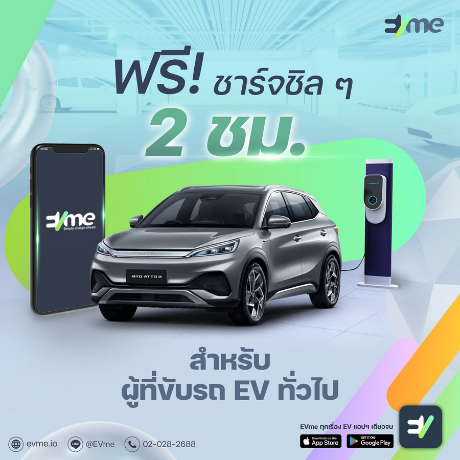 2.ฟรี! ชาร์จชิล ๆ 2 ชม. สำหรับผู้ที่ขับรถ EV ทั่วไป เพียงดาวน์โหลดแอปฯ EVme แล้วยื่นหลักฐานการโหลด และลงทะเบียนแอปฯ ให้เจ้าหน้าที่เพื่อรับโค้ดชาร์จฟรี จากนั้นดาวน์โหลดและเปิดการใช้งานเครื่องชาร์จผ่านแอปฯ on-ion ก็สามารถเข้าชาร์จไฟฟ้าฟรีได้เลย
