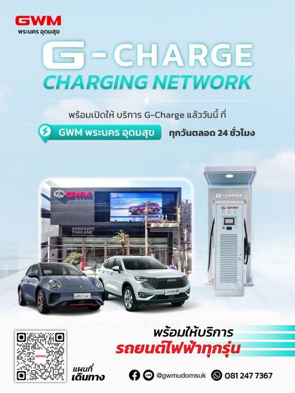 เกรทวอลล์มอเตอร์เปิดสถานี G-charge ใหม่ที่ศูนย์ GWM พระนคร อุดมสุข พร้อมให้บริการรถยนต์ไฟฟ้าทุกรุ่นทุกค่ายผ่านแอปพลิเคชัน GWM ด้วย DC Fast Charge ขนาด 120 kw.