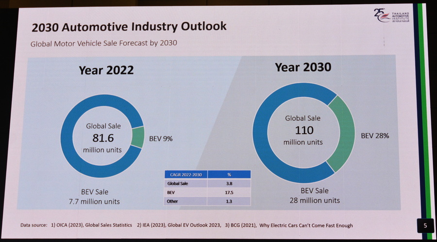 อุตสาหกรรมยานยนต์ของโลก ปีที่ 2565 มียอดขายรถยนต์ 81 ล้านคัน คาดว่าปี 2566 นี้ มียอดขายประมาณ 86 ล้านคัน โตกว่าปีที่แล้ว 6% มีการคาดการณ์อีก 2-3 ปีข้างหน้า ประมาณ 2025 จะมียอดขายรถประมาณ 94-95 ล้านคัน โตจากปัจจุบันประมาณ 10.5%