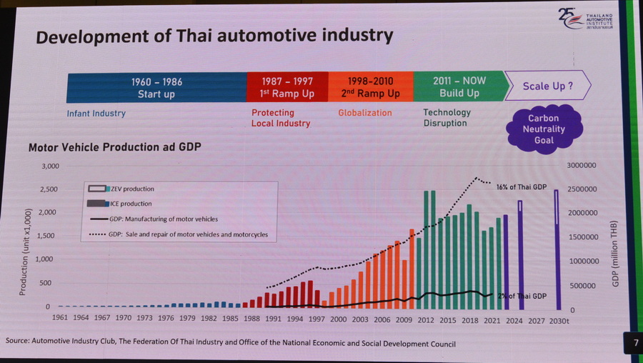 ที่ผ่านมาอุตสาหกรรมยานยนต์ไทยเราเติบโตขึ้นเรื่อย ๆ ตอนนี้ผลิตเกือบ 2 ล้านคัน ปีหน้าจะเห็นรถ EV มีการผลิตในประเทศไทยมากขึ้นเรี่อยๆ ถ้าเป็นไปตามเป้าหมาย 30@30 ของรัฐบาล ที่จะมีการผลิตรถยนต์ Zero Emission Vehicle (ZEV) 30% ในปี 2030 จะทำให้มีรถไฟฟ้า 100% ประมาณ 7 แสนกว่าคัน ถ้าเป็นไปตามแผน ประเทศไทยจะผลิตรถเพิ่มขึ้นไปอีก ประมาณ 2,500,000 คัน ตรงนี้เป็นภาพรวม positioning ไทยเราในตลาดโลก
