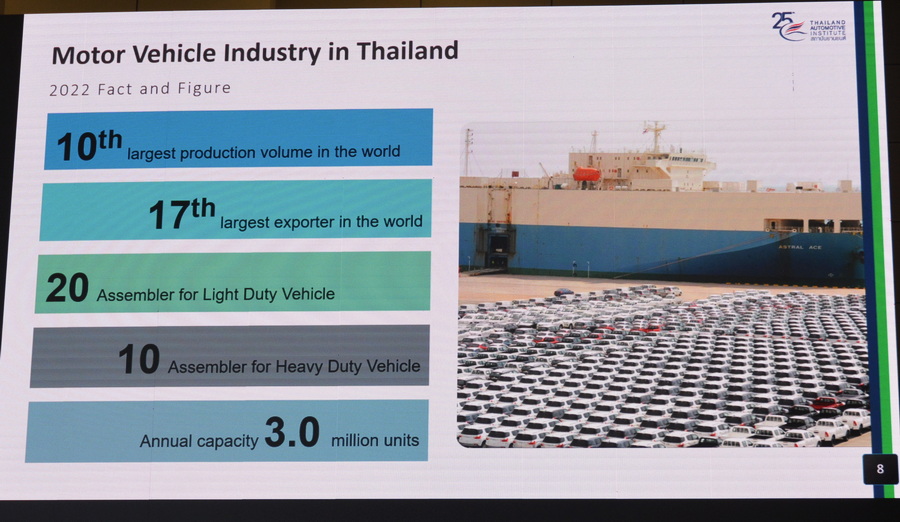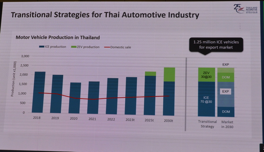 ถ้าเป็นไปตามเป้าหมาย ประเทศไทยผลิตรถอีวี 725,000 คัน ใช้ในประเทศครึ่งนึง หมายความว่าถ้าต้องการผลิตรถยนต์ในปี 2030 ให้ได้ 2,500,000 คัน ต้องส่งออกรถยนต์ที่เป็น ICE หรือ ICE ไฮบริด อย่างน้อยประมาณ 1,200,000-1,300,000 คัน หวังว่าจะทำได้ด้วยศักยภาพของผู้ประกอบการไทย