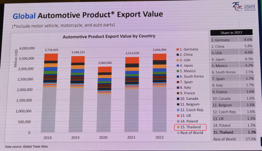 ประเทศไทยมีการส่งออกชิ้นส่วนยานยนต์จำนวนมาก ในโลกมีการส่งออกชิ้นส่วนรถยนต์ประมาณ 3-4 ล้านล้านเหรียญ อันดับ 1 คือประเทศเยอรมัน รองลงมาเป็นจีน ถ้าดูจากยอดรวมทั้งหมด ประเทศไทยส่งออกเป็นอันดับที่ 15 ในด้านของการส่งออก Auto maker assembler ทั้งมอเตอร์ไซค์ รถยนต์ และออโต้พาร์ท ส่งออกประมาณ 47,000 ล้านเหรียญ