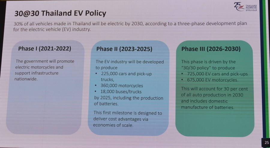 ไทยแลนด์ ออโตโมทีฟ อินดัสตรี ประเทศไทยมี 30@30 มีตั้งแต่เฟส 1 เฟส 2 และเฟส 3 ตอนนี้กำลังโปรโมทเฟส 3 ผู้ซื้อรถ EV จะได้รับเงินอุดหนุนจากภาพรัฐ ทั้งนี้เป้าหมายของเฟส 3 คือจะผลิตรถ EV 30% เป็นจำนวน 725,000 คัน ภายในปี 2030