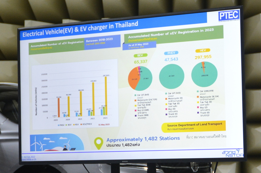 ส่วนรถยนต์ไฟฟ้าขณะนี้ยังไม่มีการทดสอบตัวรถอีวี แต่ปัจจุบัน PTEC ได้ทำงานร่วมกับค่ายรถญี่ปุ่นชั้นนำที่ทำงานร่วมกันมานานกว่าสิบปี แต่ยังไม่ได้ทำการทดสอบรถอีวี และถ้าดีลครั้งนี้สำเร็จจะเป็นการเทสต์ครั้งยิ่งใหญ่ ขณะเดียวกันในส่วนของค่ายรถไฟฟ้ารายใหญ่อย่างเทสลานั้น ได้ทำงานร่วมกันในส่วนของสถานีชาร์จ อย่างไรก็ตาม ปัจจุบันรถยนต์ไฟฟ้าที่ผ่านการทดสอบในต่างประเทศ สมอ.ใช้วิธีการยอมรับรีพอร์ตต่างประเทศ เนื่องจากก่อนหน้านี้ไทยไม่มีอินฟรานสตรัคเจอร์ ไม่มีฐานในการที่จะเทสต์ได้ครบ จึงต้องไปเทสต์ต่างประเทศ ต่อไปในอนาคตถ้าทำการทดสอบในประเทศไทยได้ทั้งหมด ก็จะทำให้นักลงทุนตัดสินใจเข้ามาลงทุนง่ายขึ้น