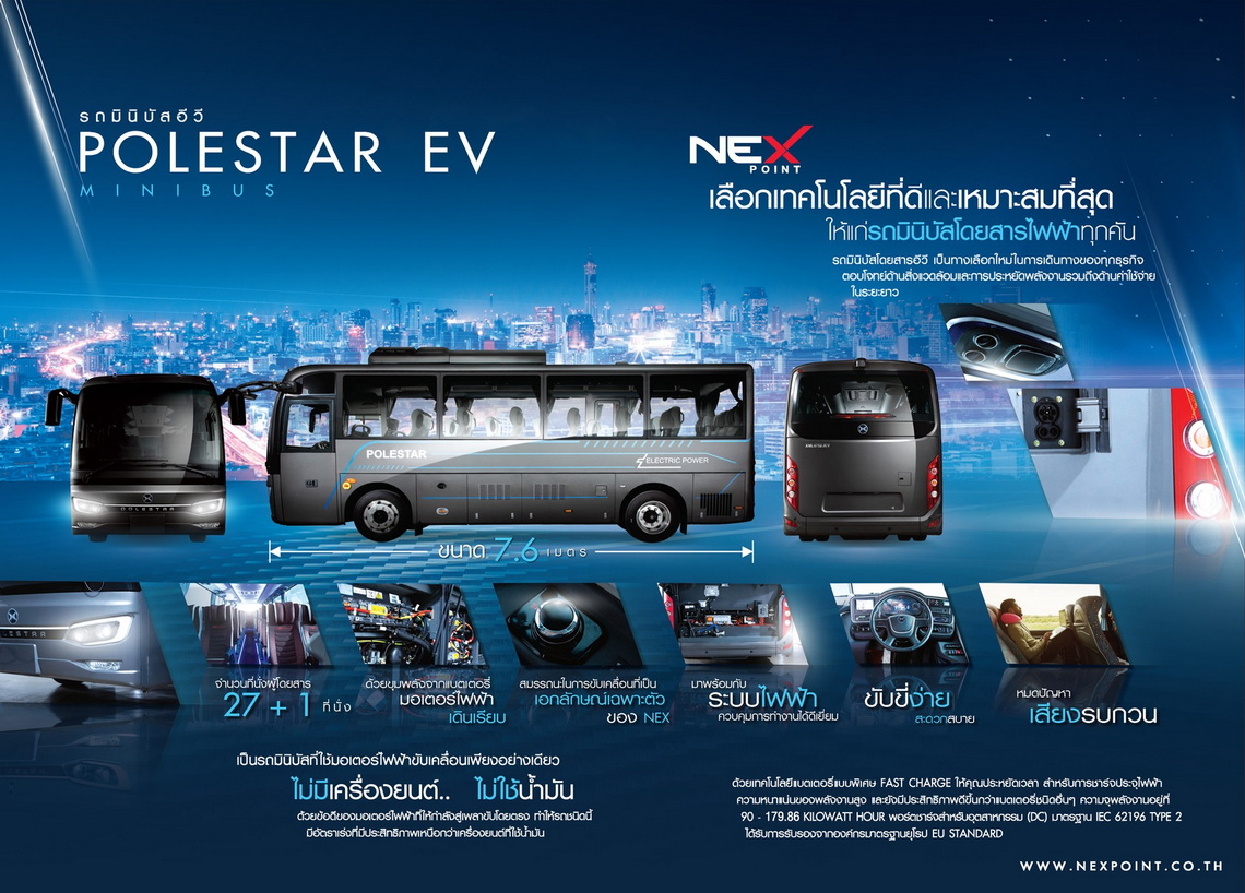 POLESTAR EV เป็นรถมินิบัสที่ใช้มอเตอร์ไฟฟ้าขับเคลื่อนล้วนๆ ด้วยข้อดีของมอเตอร์ไฟฟ้าที่ให้กำลังสู่เพลาขับโดยตรง ทำให้รถมีอัตราเร่งที่มีประสิทธิภาพเหนือกว่าเครื่องยนต์ที่ใช้น้ำมัน และด้วยเทคโนโลยีแบตเตอรี่พิเศษ fast charge ช่วยให้ประหยัดเวลาในการชาร์จประจุไฟฟ้า