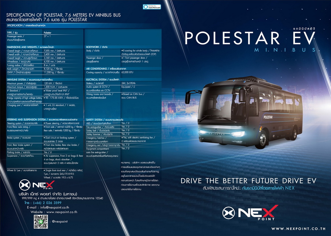 POLESTAR เป็นรถมินิบัส EV เป้นรถพลังงานไฟฟ้า 100% ขับด้วยขุมพลังจากแบตเตอรี่ มอเตอร์ไฟฟ้าเดินเรียบ ขับขี่ง่าย หมดปัญหาเรื่องเสียงรบกวน เป็นทางเลือกใหม่ในการเดินทางของทุกธุรกิจ ตอบโจทย์ด้านสิ่งแวดล้อมและการประหยัดพลังงาน