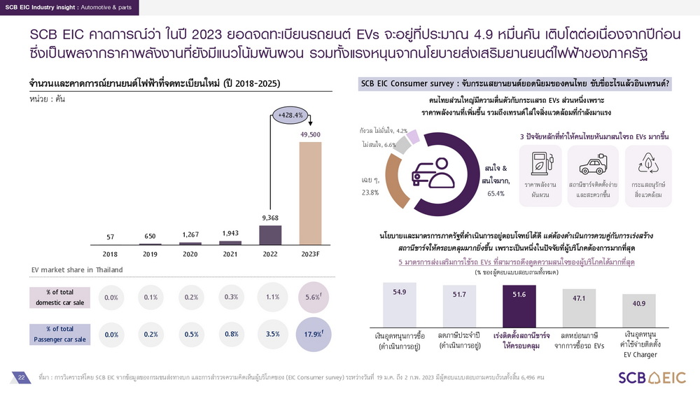 สำหรับตลาดรถยนต์ไฟฟ้า SCB EIC วิเคราะห์ว่ายังจะเติบโตแบบก้าวกระโดด คาดยอดจดทะเบียนรถ EVs ในปี 2566 จะอยู่ที่ราว 4.95 หมื่นคัน หรือเติบโตสูงถึง 430% YOY ส่งผลให้มีส่วนแบ่งตลาดเพิ่มขึ้นมาอยู่ที่ 5.6% จาก 1.1% ในปีที่ผ่านมา เติบโตต่อเนื่องจากปีก่อน ซึ่งเป็นผลจากราคาพลังงานที่ยังมีแนวโน้มผันผวน รวมทั้งแรงหนุนจากนโยบายส่งเสริมยานยนต์ไฟฟ้าของภาครัฐ รวมถึงเทรนด์ใส่ใจสิ่งแวดล้อมที่กําลังมาแรง รวมทั้งสถานีชาร์จมีการขยายตัวครอบคลุมมากขึ้น ถือเป็นหนึ่งในปัจจัยหนุนสําคัญที่จะทําให้ตลาดยานยนต์ไฟฟ้าของไทยเติบโตได้ดี