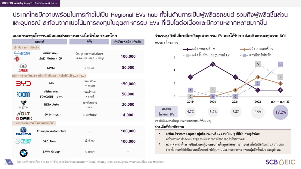 SCB EIC เชื่อว่าประเทศไทยมีความพร้อมในการก้าวไปเป็น Regional EVs hub ทั้งในด้านการเป็นผู้ผลิตรถยนต์ รวมถึงผู้ผลิตชิ้นส่วน และอุปกรณ์ สะท้อนจากแนวโน้มการลงทุนในอุตสาหกรรม EVs ที่เติบโตต่อเนื่องและมีความหลากหลายมากขึ้น