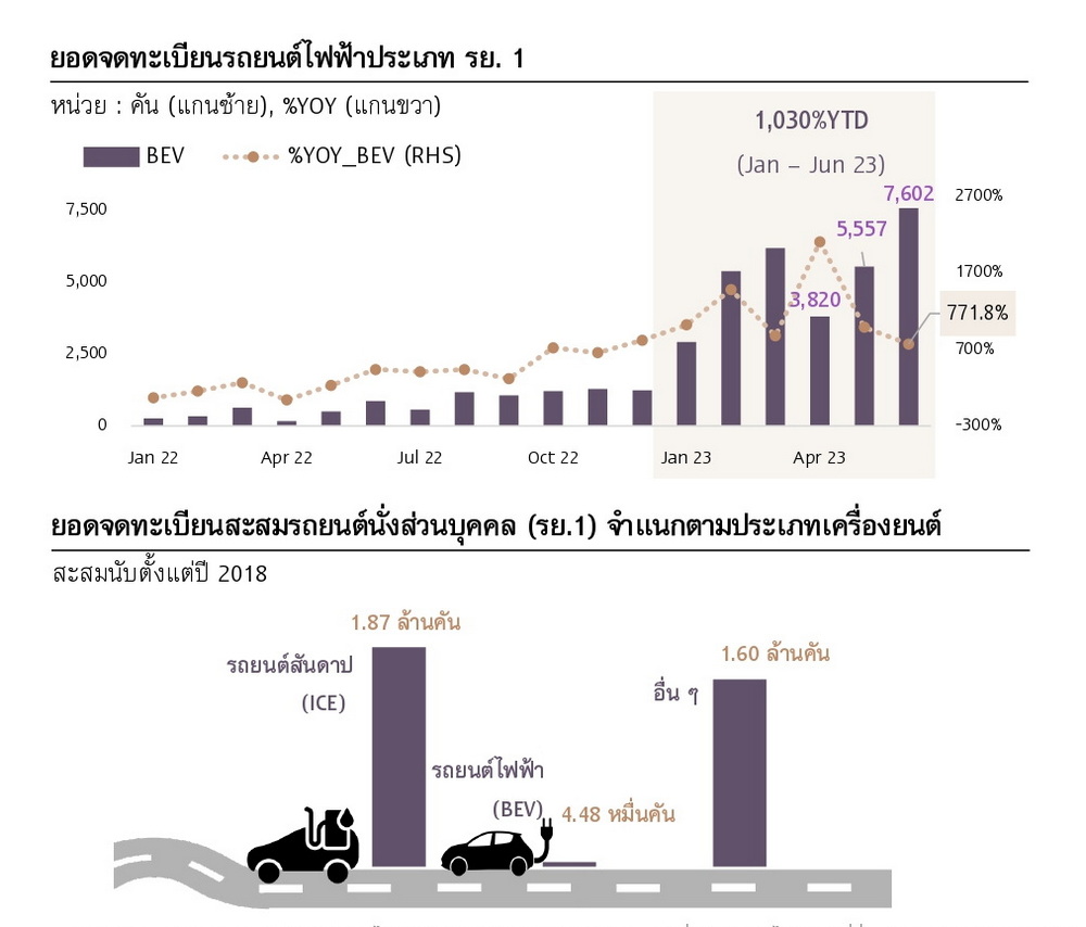 SCB EIC วิเคราะห์ตลาดรถยนต์ไฟฟ้าในไทยยังเติบโตก้าวกระโดด คาดยอดจดทะเบียนรถ EVs ในปี 2566 อยู่ที่ 4.95 หมื่นคัน เติบโตสูงถึง 430% YOY มีส่วนแบ่งตลาดเพิ่มขึ้นมาอยู่ที่ 5.6% ด้านความนิยม ครึ่งปีแรก BYD ครองแชมป์ ทำยอดขายไปแล้ว 1.1 หมื่นคัน