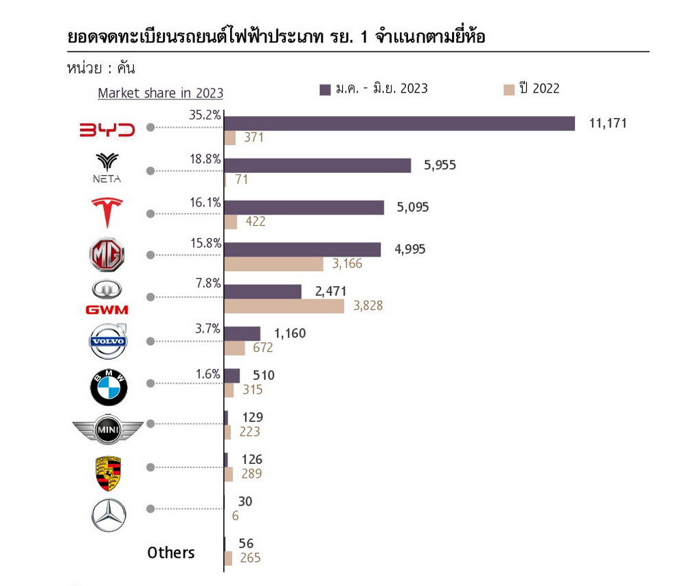 ถ้าดูแยกตามแบรนด์ ปรากฎว่าแบรนด์จากประเทศจีนได้รับความนิยมสูงที่สุดและมีส่วนแบ่งตลาดราว 80% โดย BYD ครองอันดับ 1 โดยทำยอดขายครึ่งปีแรกได้ 11,171 คัน กินส่วนแบ่งตลาด 35.2% รองลงมาเป็น NETA ขายได้ 5,955 คัน/18.8% เทสลาตามมาเป็นที่ 3 ด้วยยอดขาย 5,095 คัน/16.1% MG 4,995 คัน/15.8% และ GWM 2,471 คัน/7.8%