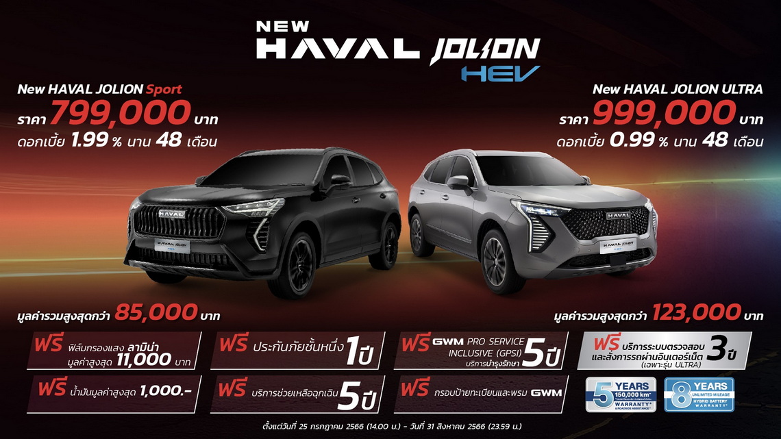 รวมมูลค่าข้อเสนอสุดพิเศษภายใต้ข้อเสนอพิเศษ PREMIERE DEAL สําหรับ New HAVAL JOLION Hybrid SUV รุ่น Sport รวมมูลค่า 85,000 บาท และรุ่น ULTRA รวมมูลค่า 123,000 บาท (*เงื่อนไขข้อเสนอและการให้บริการเป็นไปตามที่บริษัทฯ กําหนดดูรายละเอียดได้ที่ www.gwm.co.th)