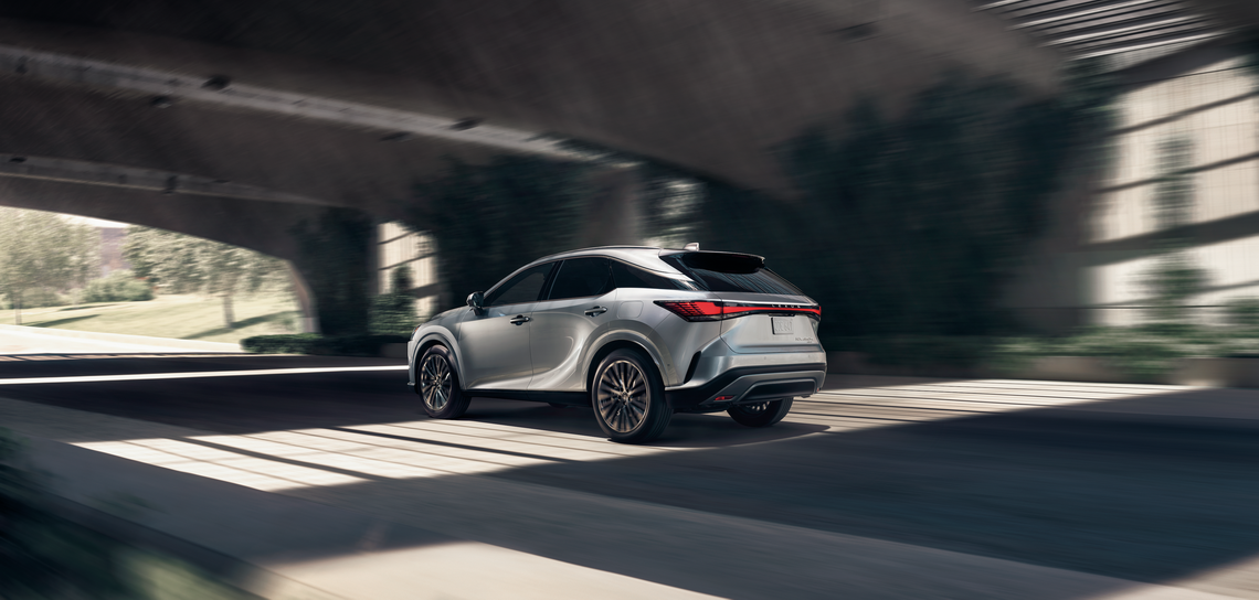 การออกแบบตัวถังแบบแกนหมุนและกระจังหน้าแบบไร้รอยต่อทำให้รูปลักษณ์ดูแข็งแกร่ง สะอาดตา แสดงออกถึงความสปอร์ตและกลเม็ดเด็ดพรายในรูปทรงไดนามิกที่ซับซ้อน จุดศูนย์ถ่วงต่ำ ถูกขับเน้นด้วยล้ออัลลอยขนาดมาตรฐาน 21 นิ้ว 20 ก้านพร้อมผิวสีเมทัลลิคระดับพรีเมียม ด้านหลังติดตั้งไฟท้ายแบบเลนส์เดี่ยวล้อมรอบตัวรถ ขับเน้นรูปทรงที่กว้างและต่ำของ RX ให้ชัดเจนยิ่งขึ้น