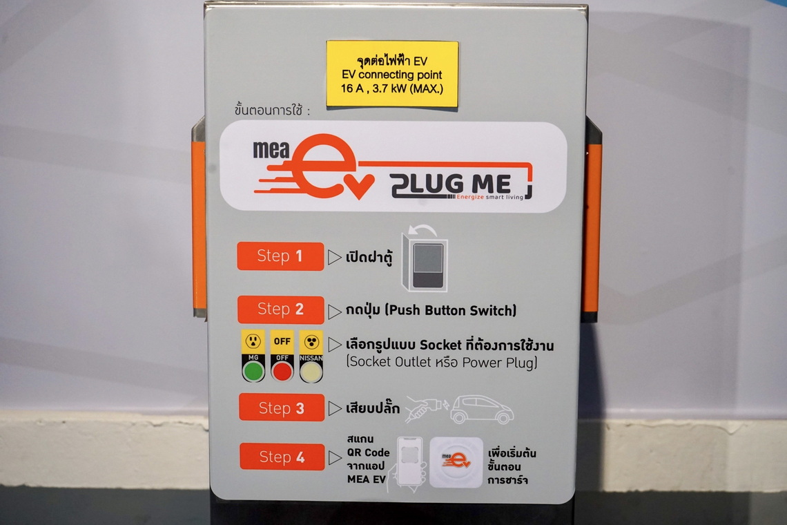 ปัจจุบัน MEA ได้ดำเนินโครงการ PLUG ME EV ในระยะแรกแล้วเสร็จ โดยเปิดให้บริการอัดประจุผ่านอุปกรณ์ชาร์จที่มาพร้อมกับยานยนต์ไฟฟ้า (Portable EV Charger) จำนวน 12 ช่องจอด ในรูปแบบการชาร์จโหมด 2 ขนาดพิกัด 3.7 กิโลวัตต์ และมีแผนต่อยอดพัฒนาและขยายผลเป็นรูปแบบหัวชาร์จมาตรฐาน AC Type 2 Connector ขนาดพิกัด 7.4 - 44 กิโลวัตต์ เพิ่มเติมอีกจำนวน 18 ช่องจอด โดยการชาร์จทั้งหมดผู้ใช้บริการสามารถใช้งานผ่าน MEA EV Application ได้อย่างสะดวกสบาย