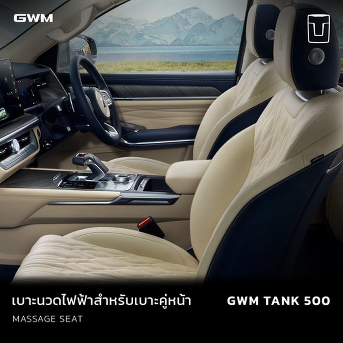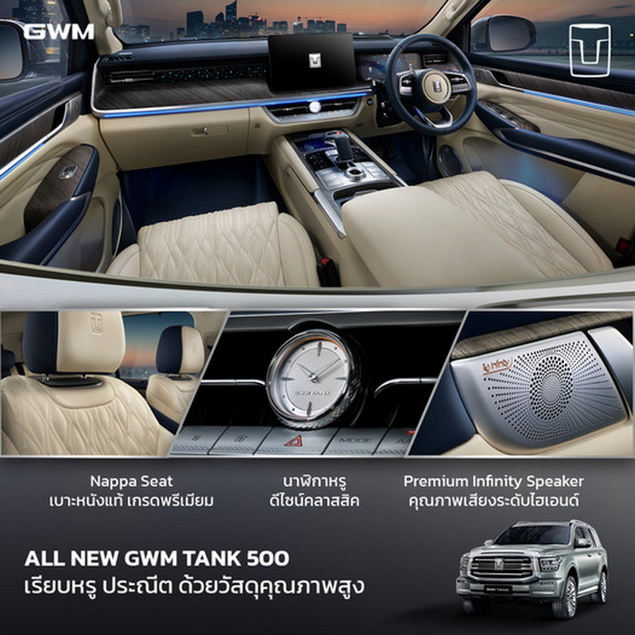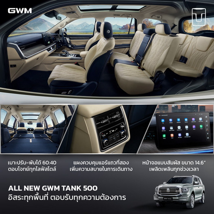 All-New GWM Tank 500 มาพร้อมระบบอินโฟเทนเมนต์อัจฉริยะที่รองรับการเชื่อมต่อไร้สายเต็มรูปแบบ จัดเต็มทุกความบันเทิง พร้อมกับเครื่องเสียงคุณภาพเยี่ยม โดดเด่นด้วยหน้าจอสัมผัสขนาดใหญ่ 14.6 นิ้วกึ่งกลางแดชบอร์ดที่เป็นศูนย์กลางการควบคุมระบบความบันเทิงของรถ รองรับการเชื่อมต่อ Bluetooth กับสมาร์ตโฟน