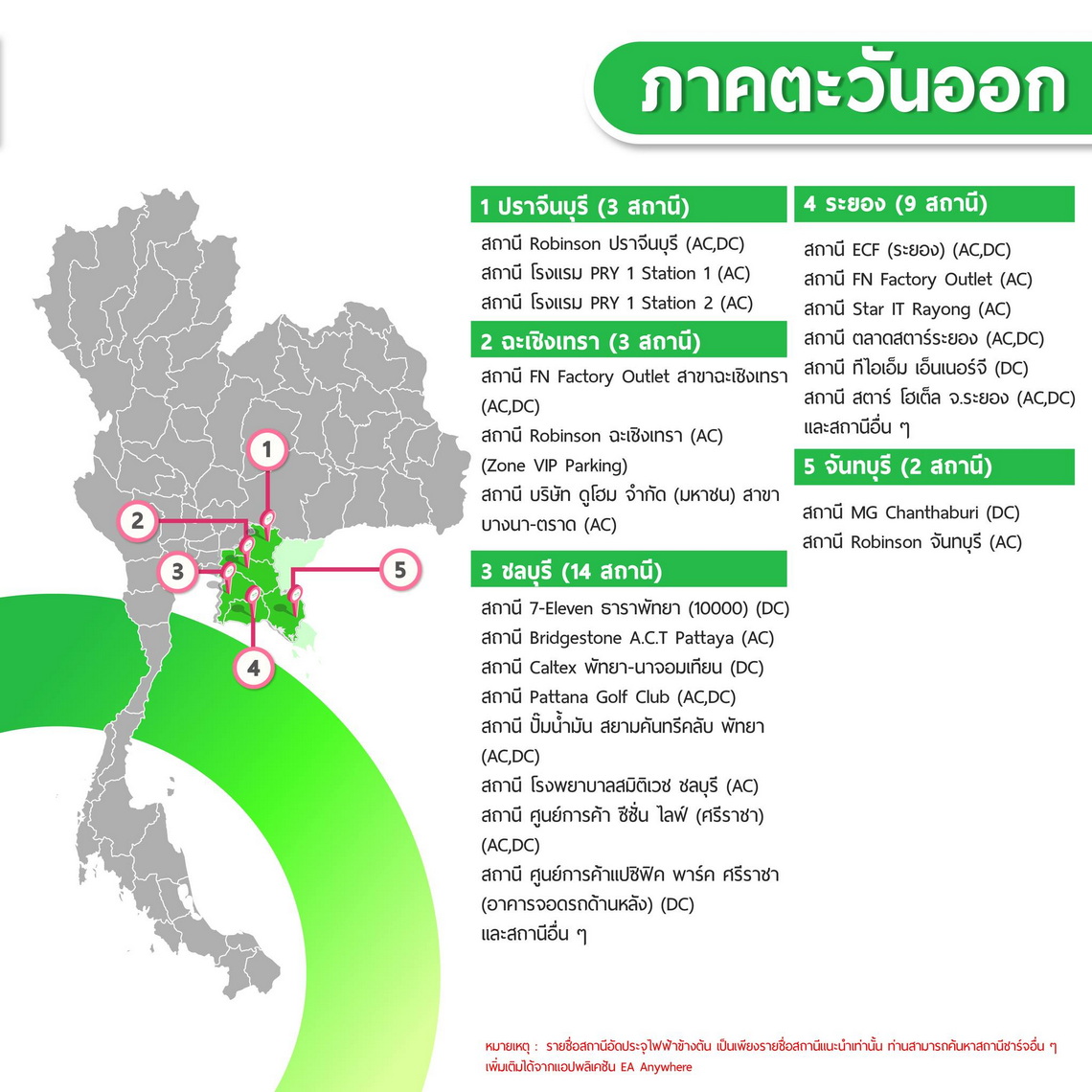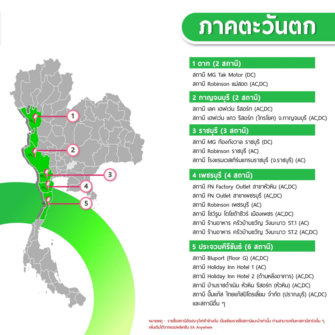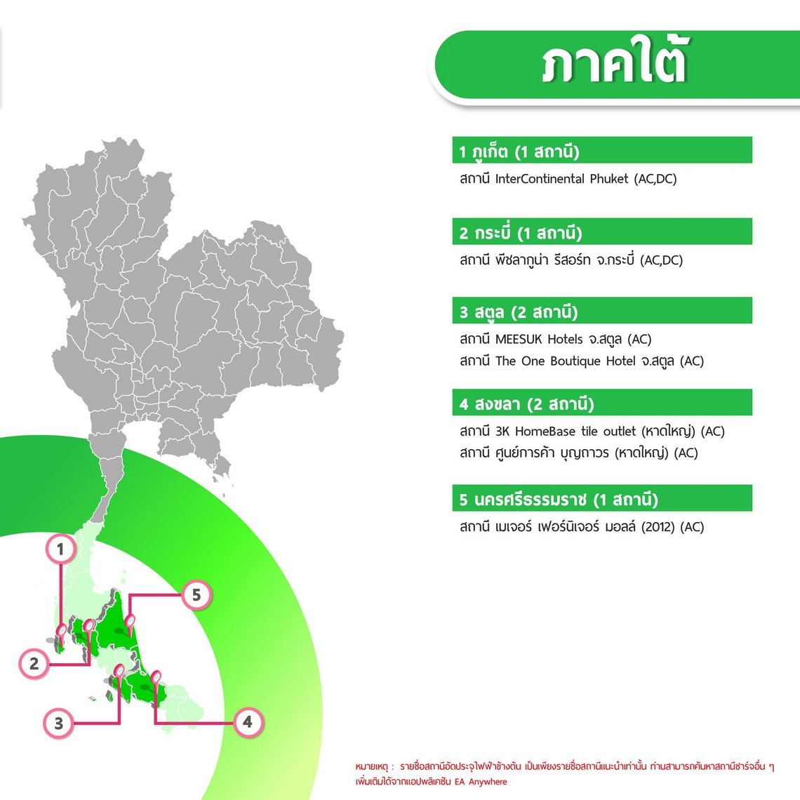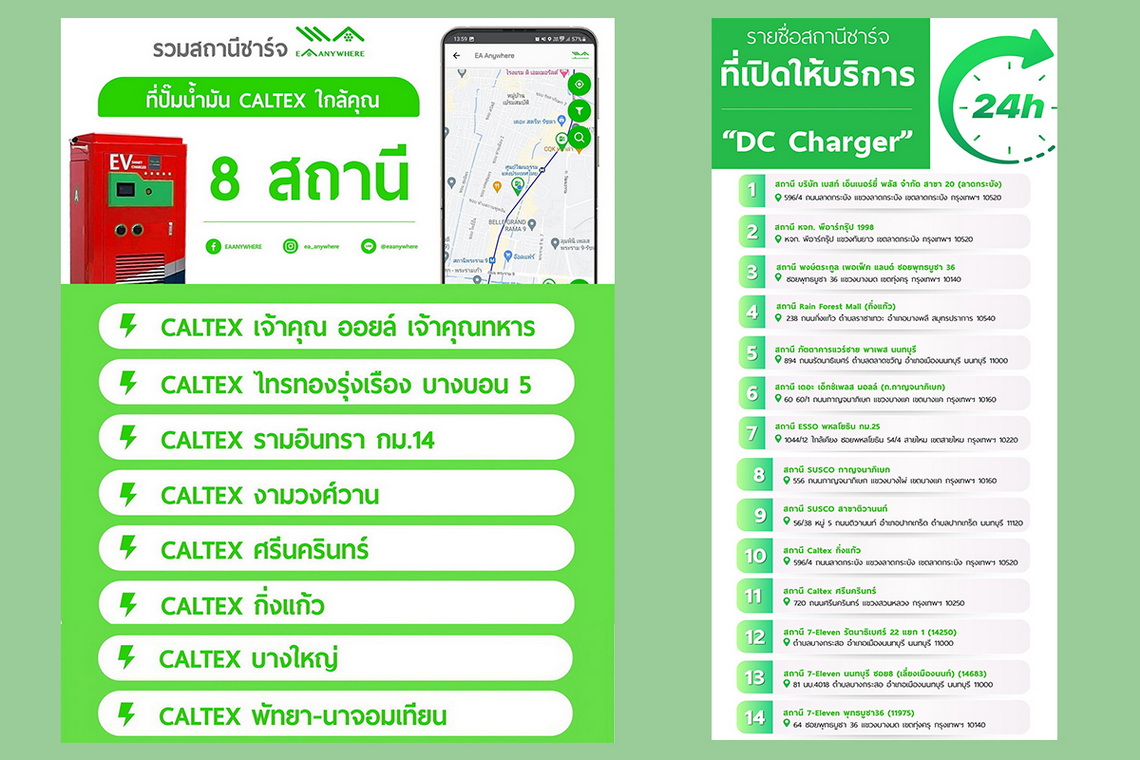 นอกจากนี้ EA Anywhere ยังอัปเดตรายชื่อสถานีชาร์จ EA Anywhere ที่เปิดให้บริการ 24 ชั่วโมง เพิ่มเติม ได้แก่