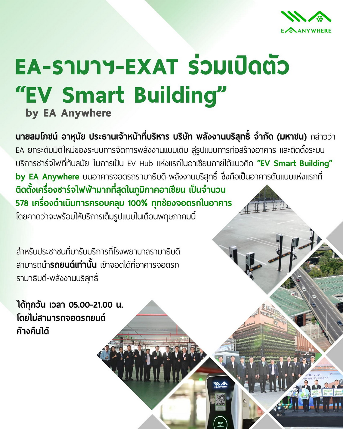 ปัจจุบัน สถานีชาร์จในโครงข่าย EA Anywhere ดำเนินการโดยบริษัท พลังงานมหานคร จำกัด ให้บริการแล้ว กว่า 494 สถานีทั่วประเทศ และตั้งเป้าขยายสถานีชาร์จไปสู่ธุรกิจการจัดการพลังงาน "EV Smart Building" by EA Anywhere เพื่อให้ผู้ใช้รถ EV โดยเฉพาะอย่างยิ่งผู้ใช้รถในอาคาร มีความมั่นใจในการเลือกใช้ยานยนต์ไฟฟ้ามากยิ่งขึ้น