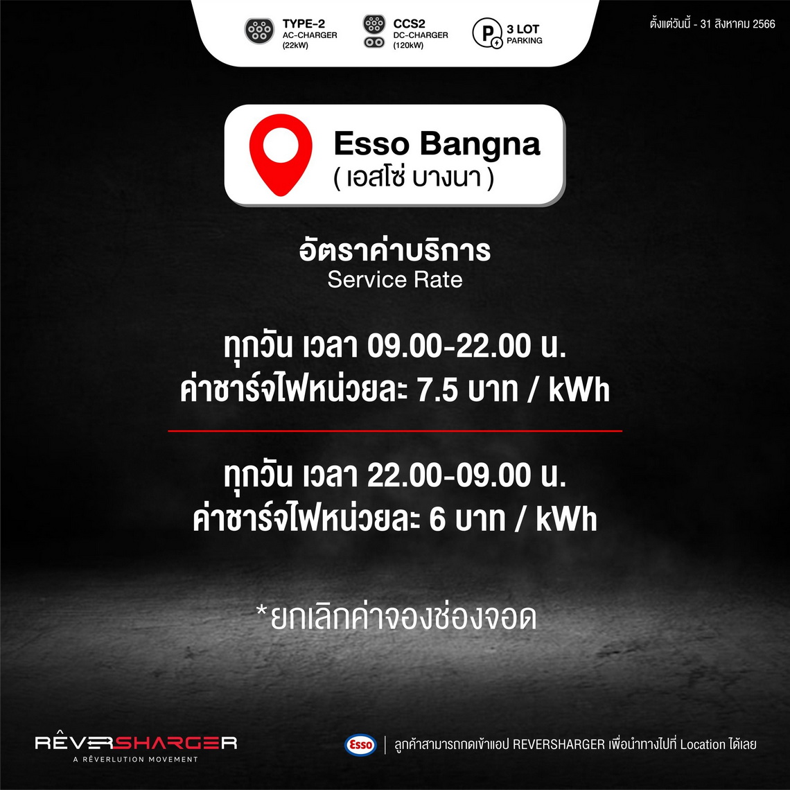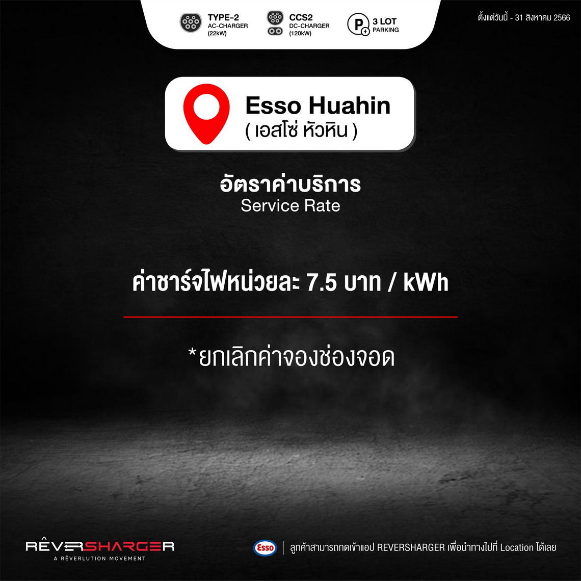 สำหรับโปรโมชั่นช่วงนี้ ใครเดินทางไปหัวหินใช้บริการได้ที่ RêverSharger ในปั๊ม Esso Huahin ลดค่าไฟในทุกช่วงเวลา ปรับราคาลงเหลือ 7.5 บาท/kWh ให้บริการด้วยเครื่องชาร์จแบบ DC CCS2 กำลังไฟสูงสุดถึง 120 kW