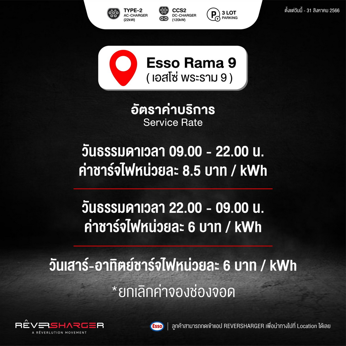 ที่ถนนพระราม 9 RêverSharger เปิดให้บริการที่ปั๊ม Esso Rama 9 ให้บริการด้วยเครื่องชาร์จแบบ Quick Charge 120kw หัวชาร์จแบบ DC CCS2 ค่าไฟในช่วงโปรโมชั่น