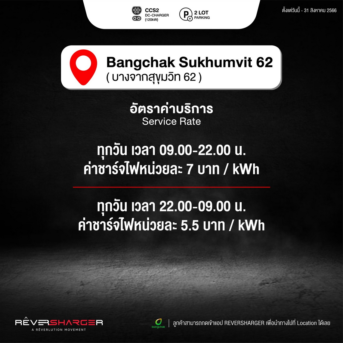 สถานีชาร์จ RêverSharger ที่ Bangchak สุขุมวิท 62 จัดโปรโมชันลดค่าไฟเช่นกัน