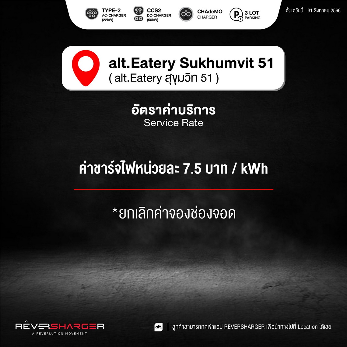 ส่วนสถานีชาร์จใจกลางกรุงเทพ ที่สุขุมวิท 51 RêverSharger จัดโปรโมชันลดค่าไฟในทุกช่วงเวลา ปรับราคาลงเหลือ 7.5 บาท/kWh ใช้บริการได้ที่ alt.Eatery Sukhumvit 51