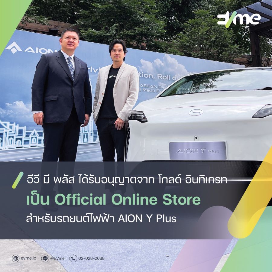 บริษัท อีวี มี พลัส จำกัด ได้รับอนุญาตให้เป็นหน้าร้านออนไลน์อย่างเป็นทางการ (Official Online Store) จากบริษัท โกลด์ อินทิเกรท จำกัด สำหรับรถยนต์ไฟฟ้าแบรนด์ AION ที่กำลังจะเปิดตัวในประเทศไทย โดยรถ AION รุ่น Y Plus จะเปิดให้เช่าและวางจำหน่ายบนแพลตฟอร์ม EVme เป็นการเน้นย้ำการเป็นผู้นำด้านการให้บริการโซลูชันยานยนต์ไฟฟ้าแบบครบวงจรของ EVme