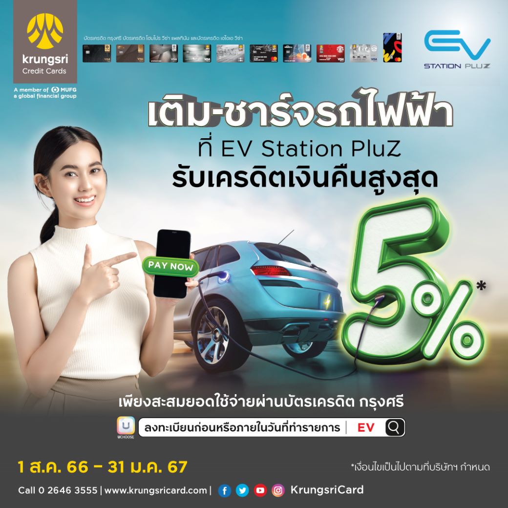 โปรที่ 2 ร่วมกับบัตรเครดิต กรุงศรีสนับสนุนรักษาสิ่งแวดล้อมกับการใช้รถพลังงานไฟฟ้ารับเครดิตเงินคืนสูงสุด 5%* เมื่อสะสมยอดใช้จ่ายผ่านบัตรเครดิต กรุงศรี ที่แอป EV Station PluZ