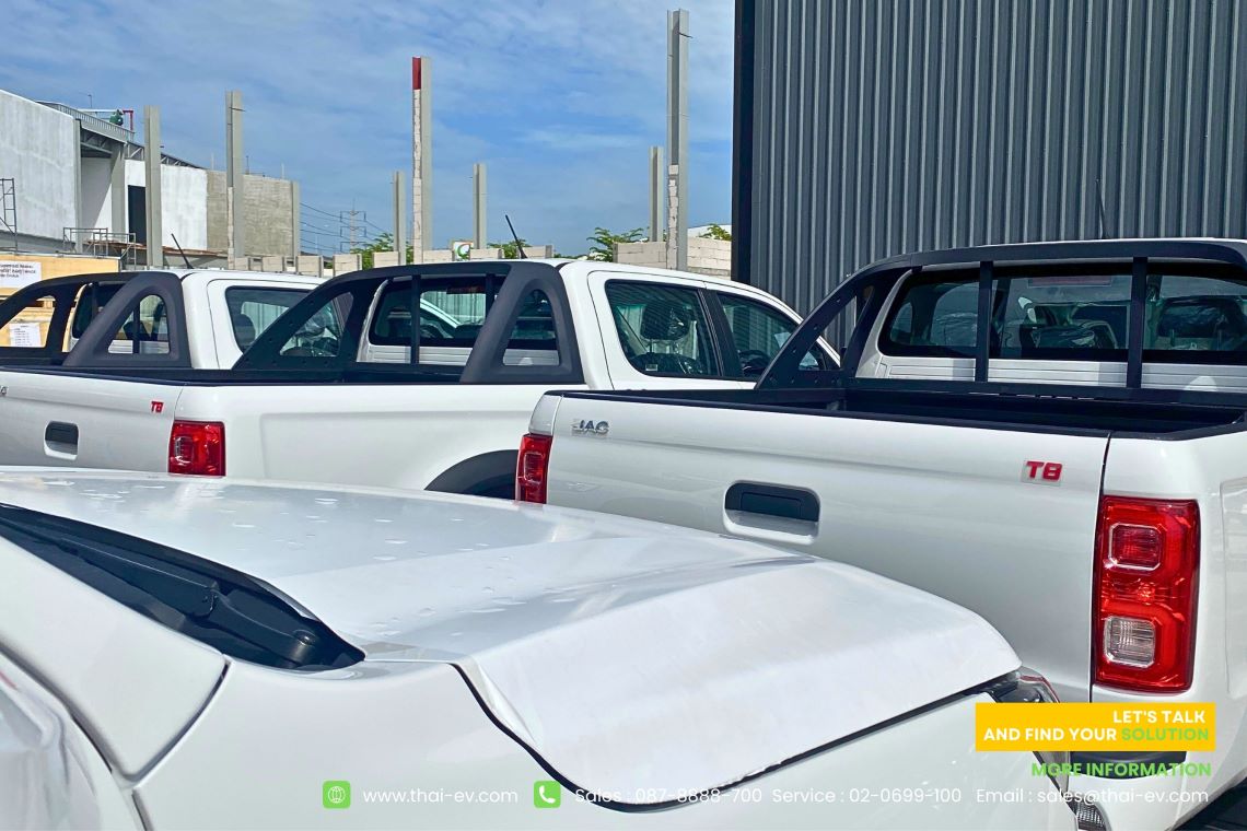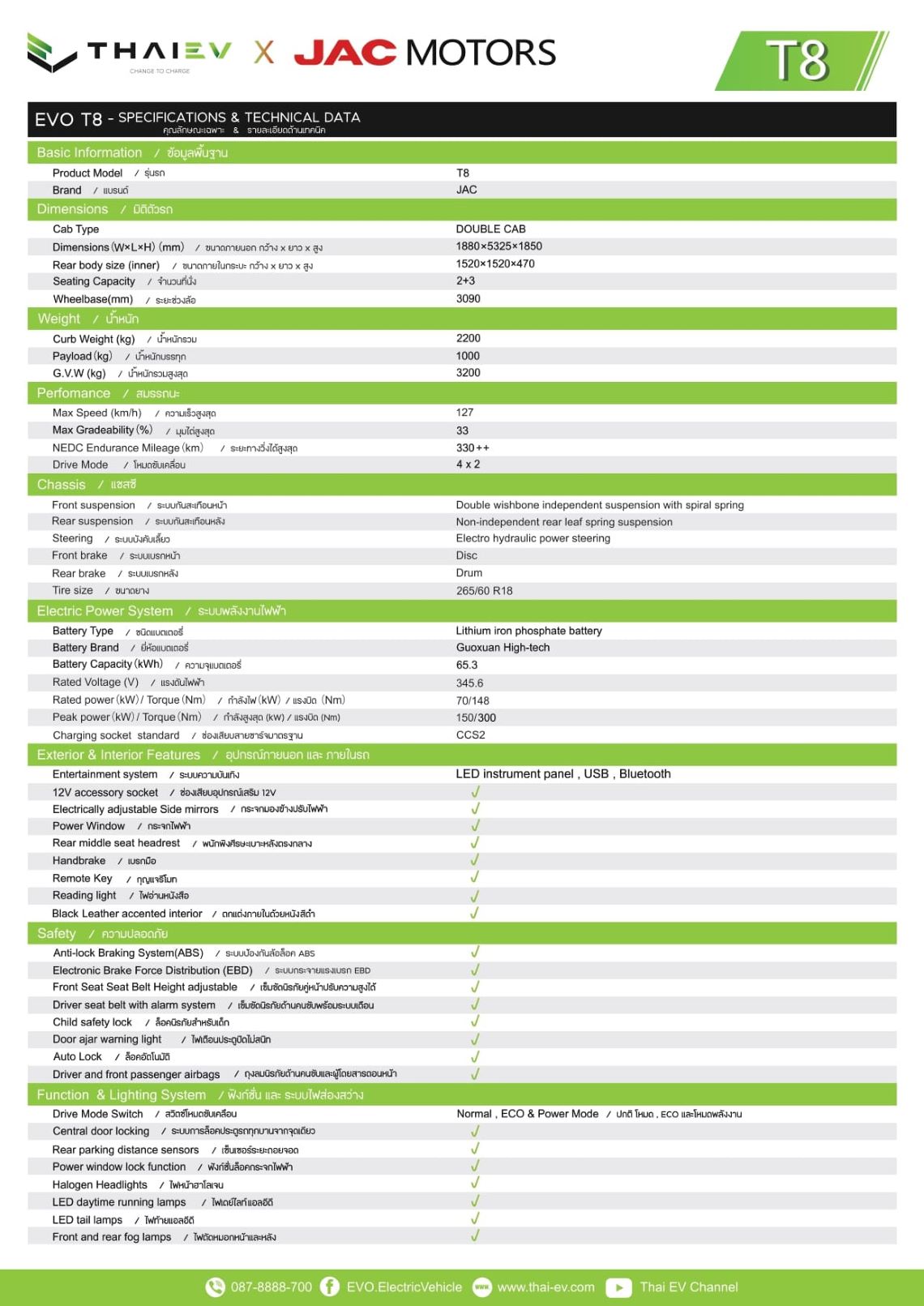 สำหรับรถรุ่นที่ “ไทยอีวี” นำเข้ามาจำหน่ายในประเทศไทยเป็นรุ่น T8 หรือที่เรียกชื่อเต็มๆ ว่า “JAC T8 EV”เป็นรถกระบะไฟฟ้า 100% สเปคก็จะเป็นแบตเตอรี่ ลิเธียมไอออน ความจุ 65.3 กิโลวัตต์ มอเตอร์อยู่ที่ 70/150 มีกำลัง 201 แรงม้า วิ่งได้ระยะทาง 330 กม.ต่อ 1 ชาร์จ อัตราการกินไฟอยู่ที่ 0.8 สตางค์ ก็คือ 100 กม. ค่าไฟอยู่ที่ 80 บาท หรือกิโลละ 80 สตางค์ ถ้าเทียบกับปิกอัพทั่วไปจ่ายค่าน้ำมันอยู่ที่ 3.4 บาทต่อกม.ประเมินว่าประหยัดกว่าน้ำมันประมาณ 3-4 เท่า ราคาจำหน่ายอยู่ที่ประมาณ 1 ล้านต้น ๆ