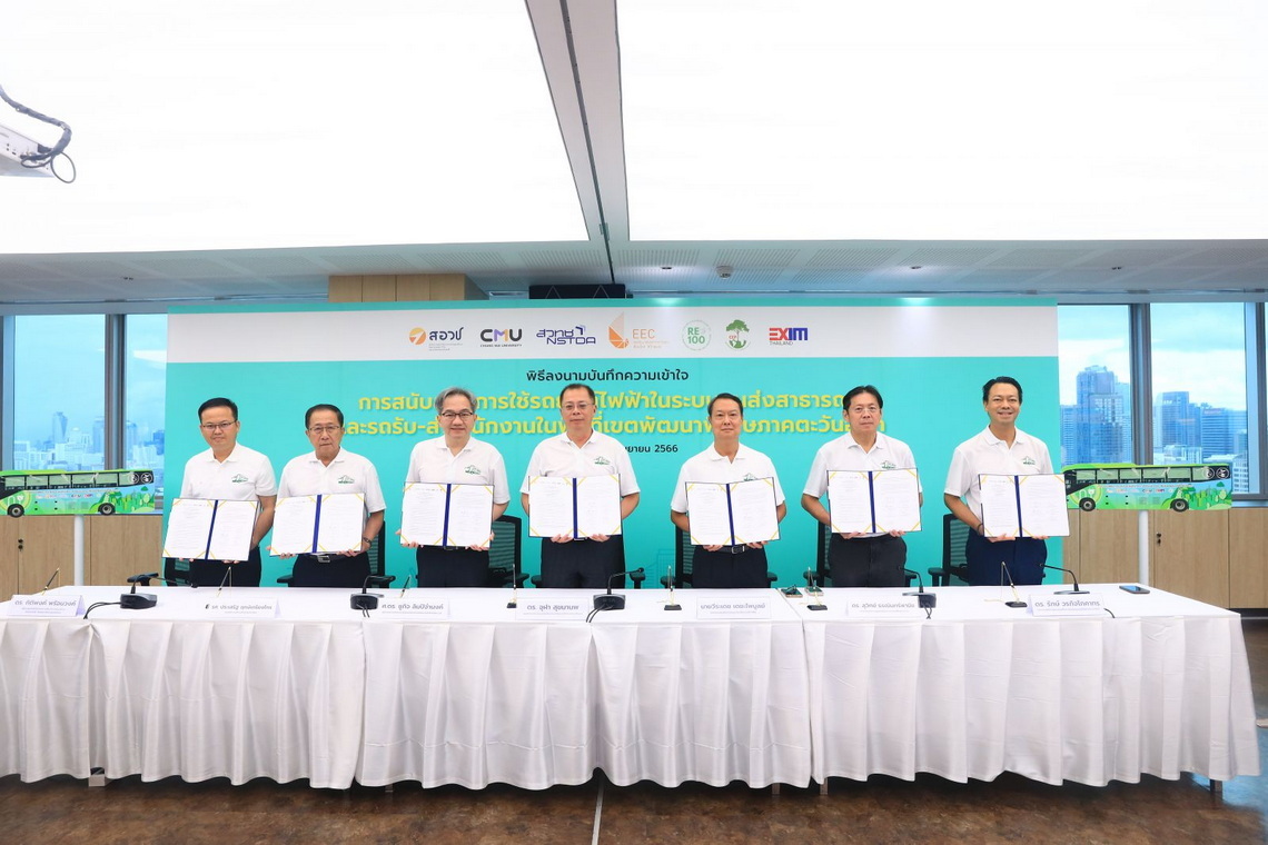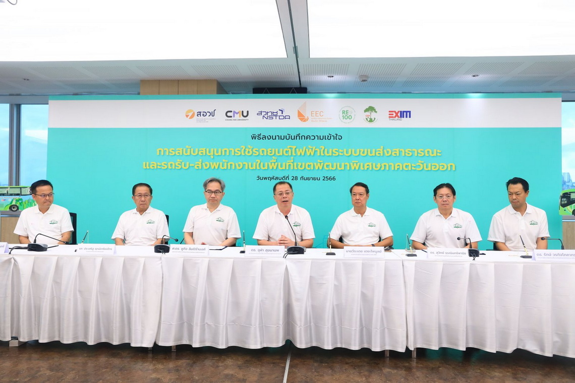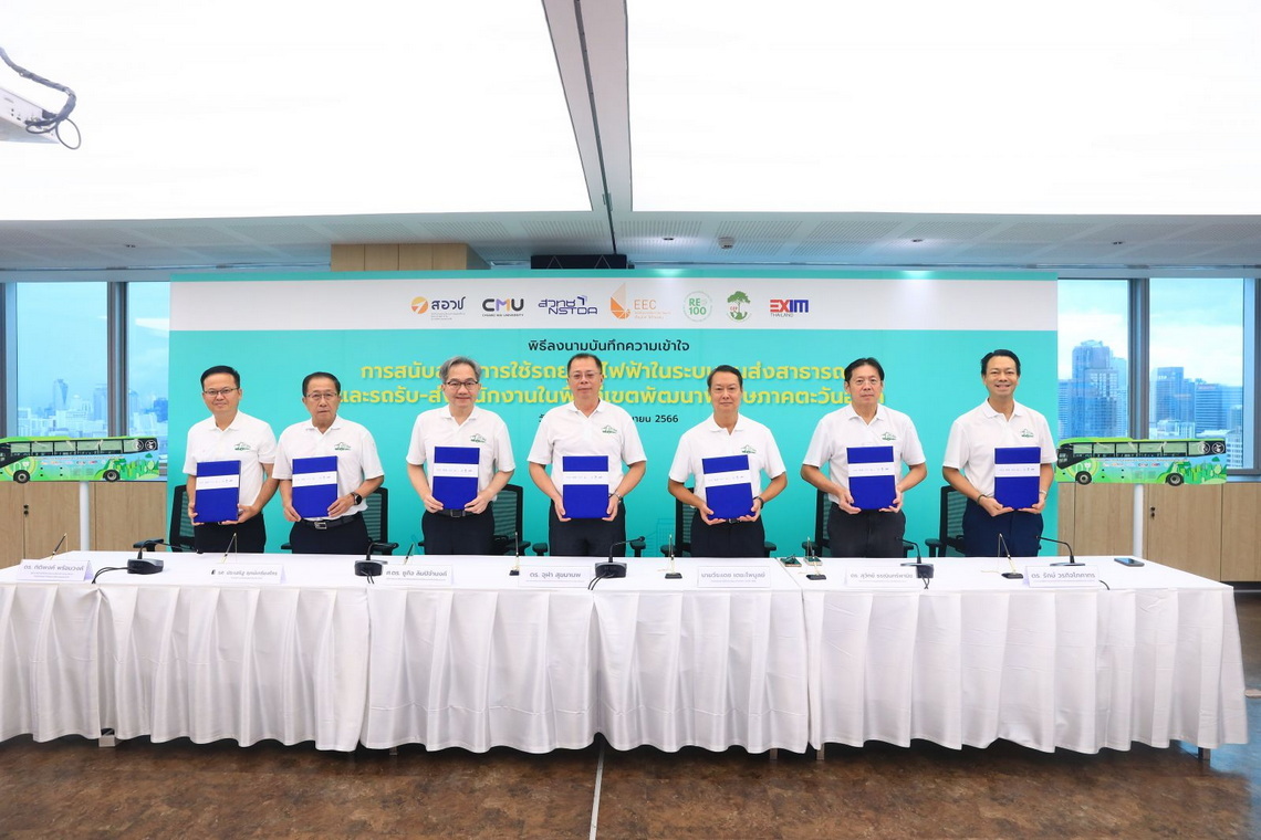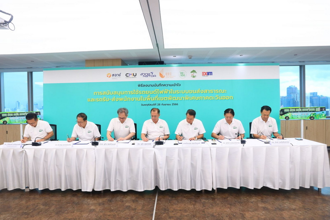 วันที่ 28 ก.ย.2566 นายจุฬา สุขมานพ เลขาธิการคณะกรรมการนโยบายเขตพัฒนาพิเศษภาคตะวันออก (สกพอ.) หรืออีอีซี ลงนามบันทึกข้อตกลงความร่วมมือการสนับสนุนการใช้รถยนต์ไฟฟ้าในระบบขนส่งสาธารณะ และรถรับ-ส่งพนักงานในพื้นที่เขตพัฒนาพิเศษภาคตะวันออก ร่วมกับ นายกิติพงค์ พร้อมวงค์ ผู้อำนวยการสำนักงานสภานโยบายการอุดมศึกษา วิทยาศาสตร์ วิจัยและนวัตกรรมแห่งชาติ ศาสตราจารย์ชูกิจ ลิมปิจำนงค์ ผู้อำนวยการสำนักงานพัฒนาวิทยาศาสตร์และเทคโนโลยีแห่งชาติ ศาสตราจารย์ นพ.พงษ์รักษ์ ศรีบัณฑิตมงคล อธิการบดีมหาวิทยาลัยเชียงใหม่ นายรักษ์ วรกิจโภคาทร กรรมการผู้จัดการ ธนาคารเพื่อการส่งออกและนำเข้าแห่งประเทศไทย นายวีระเดช เตชะไพบูลย์ นายกสมาคมพลังงานหมุนเวียนไทย (อาร์อี 100) และนายสุวิทย์ ธรณินทร์พานิช ประธานกรรมการมูลนิธิพลังงานสะอาดเพื่อประชาชน เพื่อส่งเสริมให้เกิดความร่วมมือภาครัฐและเอกชนในด้านการพัฒนาเทคโนโลยีถ่ายทอดองค์ความรู้ ขับเคลื่อนการลงทุนและใช้ประโยชน์จากรถยนต์ไฟฟ้าในระบบขนส่งสาธารณะและรับส่งพนักงาน เพื่อนำไปสู่การพัฒนาพื้นที่อีอีซีอย่างยั่งยืน ณ ห้อง Conference 1-2 สำนักงานอีอีซี