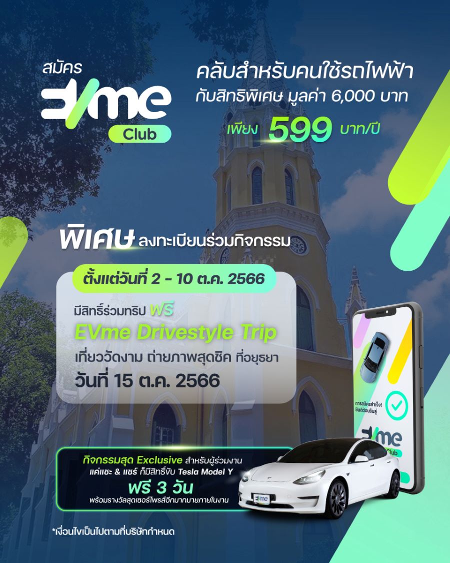 EVme Club จัดโปรโมชั่นพิเศษระหว่าง 2-10 ต.ค. 2566 ลุ้นรับสิทธิพิเศษเพิ่ม 2 ต่อ! ต่อที่ 1 รับสิทธิ์ร่วมทริป “EVme DriveStyle Trip to Ayutthaya 2023” ต่อที่ 2 ลุ้นขับ Tesla Model Y ฟรี 3 วัน