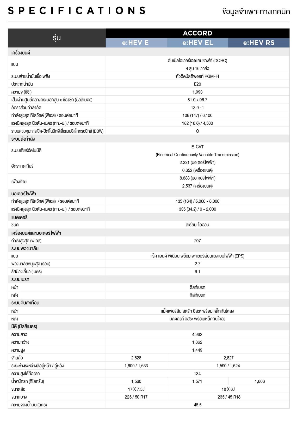 ฮอนด้า ประเทศไทย เปิดตัว All-new Honda Accord e:HEV ขุมพลังขับเคลื่อนฟูลไฮบริด e:HEV มอเตอร์ไฟฟ้า 2 ตัว แรงบิดสูงสุด 335 นิวตัน-เมตร เคาะราคาเริ่มต้น 1,529,000 บาท ตัวท็อป รุ่น RS ราคา 1,799,000 บาท