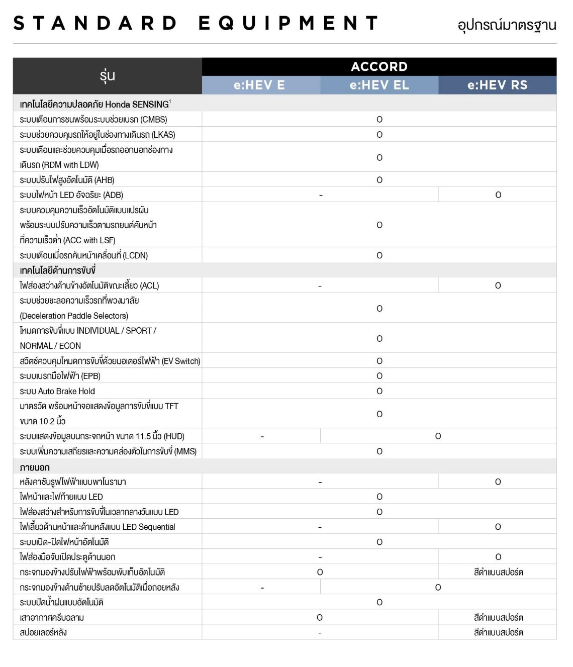 บริษัท ฮอนด้า ออโตโมบิล (ประเทศไทย) จำกัด ประกาศราคา “ฮอนด้า แอคคอร์ด อี:เอชอีวี ใหม่” อย่างเป็นทางการ โดยราคารุ่น e:HEV E ราคา 1,529,000 บาท รุ่น e:HEV EL ราคา 1,669,000 บาท และรุ่น e:HEV RS ราคา 1,799,000 บาท
