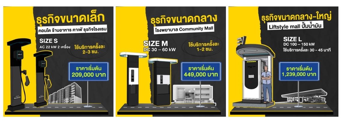 โดยรูปแบบการลงทุนขึ้นอยู่กับจำนวนคนที่จะเข้ามาใช้พื้นที่ หรือเข้ามาจอดรถใช้เวลานานแค่ไหน หากประเมินว่าใช้เวลา 2-3 ชั่วโมง ก็แนะนำให้เลือกไซส์ S ดีกว่าลงทุนตู้ชาร์จขนาดไซส์ L ที่ใช้เวลาชาร์จแค่ครึ่งชั่วโมง เพราะเจ้าของรถอาจจะไม่สะดวกในการย้ายที่จอดรถ