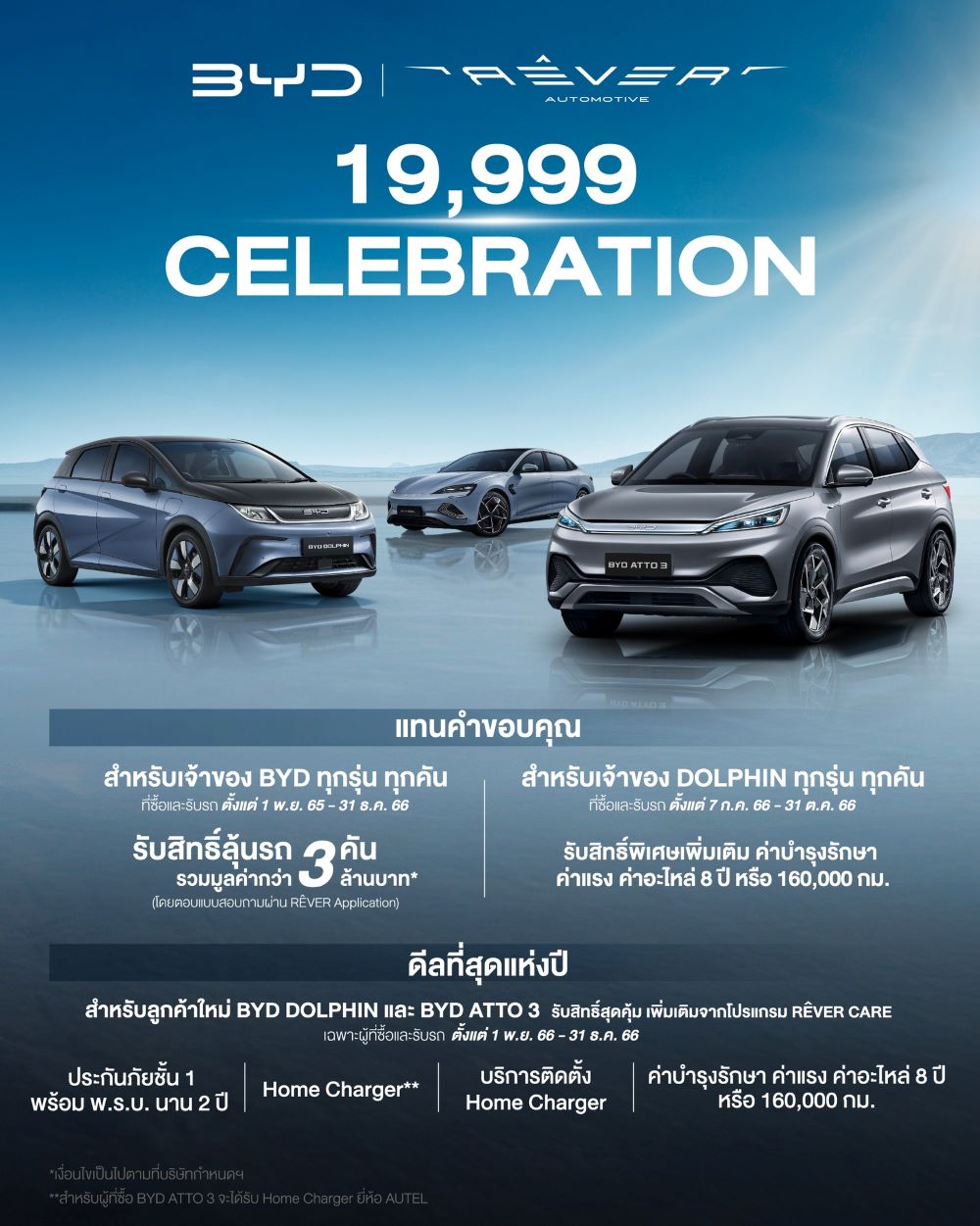 ดีลสำหรับลูกค้าใหม่ BYD DOLPHIN และ BYD ATTO 3 ที่ซื้อและรับรถ ตั้งแต่ 1 พ.ย. 66 - 31 ธ.ค. 66 รับสิทธิ์เพิ่มเติมจาก RÊVER Care/ประกันภัยชั้น 1 พร้อม พ.ร.บ. นาน 2 ปี/Home Charger/บริการติดตั้ง Home Charger/ค่าบำรุงรักษา ค่าแรง และค่าอะไหล่ นาน 8 ปี หรือ 160,000 กิโลเมตร