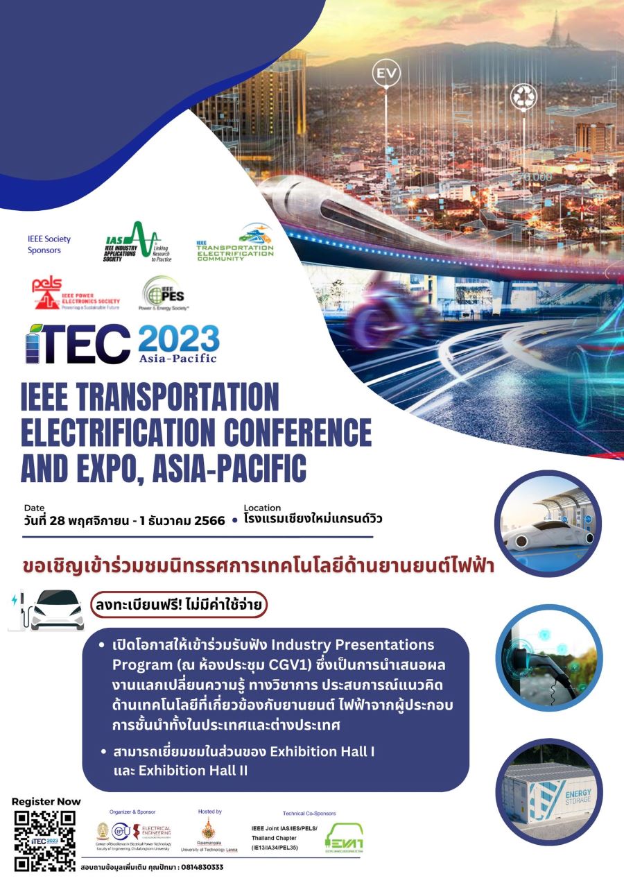 การประชุมและนิทรรศการ IEEE Transport Electrification Conference and Expo ประจำปี 2566 เอเชียแปซิฟิก (ITEC Asia-Pacific 2023) จัดขึ้นโดยศูนย์ความเป็นเลิศด้านเทคโนโลยีพลังงานไฟฟ้า (CEPT) จุฬาลงกรณ์มหาวิทยาลัย และมหาวิทยาลัยเทคโนโลยีราชมงคลล้านนา (RMUTL) สาขาวิชาเทคนิค ร่วมกับ IEEE Joint IAS/IES/PELS Thailand Chapter และสมาคมยานยนต์ไฟฟ้าแห่งประเทศไทย (EVAT)