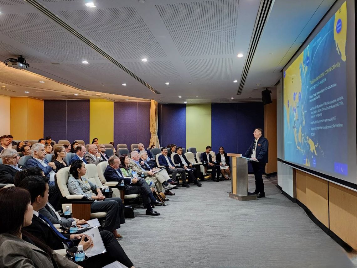 ดร.จุฬา สุขมานพ เลขาธิการคณะกรรมการนโยบายเขตพัฒนาพิเศษภาคตะวันออก (สกพอ.) ได้บรรยายพิเศษ ในหัวข้อ Investment Opportunities in EEC และตอบข้อซักถามจากเอกอัครทูตอียู เพื่อสร้างความมั่นใจถึงความพร้อมด้านต่างๆ ของอีอีซี อาทิ ความก้าวหน้าด้านโครงสร้างพื้นฐาน การส่งเสริมสิทธิประโยชน์ใน 5 คลัสเตอร์หลัก (การแพทย์สุขภาพ ดิจิทัล ยานยนต์ไฟฟ้า (อีวี) BCG และบริการ) การพัฒนาระบบนิเวศรับการลงทุนในมิติต่างๆ การอนุญาตอยู่อาศัยในระยะยาวกรณีพิเศษ การให้บริการภาครัฐแบบครบวงจร (EEC OSS) เป็นต้น ณ ห้องประชุมราชพฤกษ์ นิคมอุตสาหกรรมอมตะซิตี้ จังหวัดชลบุรี