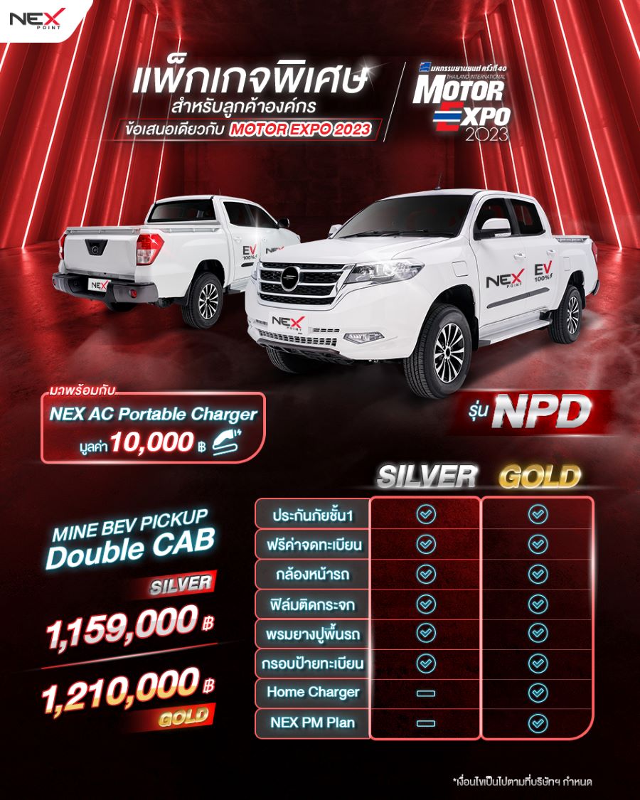 บริษัท เน็กซ์ พอยท์ จำกัด (มหาชน) จะนำรถกระบะไฟฟ้า 4 ประตู MINE BEV PICKUP DOUBLE CAB รุ่น NPD ระบบขับเคลื่อนด้วยพลังงานไฟฟ้า 100% และ MINE BEV PICKUP SINGLE CAB รุ่น NPS ยานยนต์ไฟฟ้าเชิงพาณิชย์ พร้อมแพ็กเกจพิเศษสำหรับลูกค้าองค์กร แถมเครื่องชาร์จ NEX AC Portable Charger มูลค่า 10,000 บาท ที่บูธ NEX POINT ในงาน Motor Expo 2023 ครั้งที่ 40 ตั้งแต่วันที่ 29 พฤศจิกายน - 11 ธันวาคม 2566 ณ อาคารชาเลนเจอร์ อิมแพ็ค เมืองทองธานี