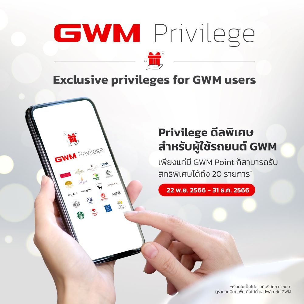 นอกจากนี้ GWM ยังส่งความสุขส่งท้ายปีด้วยโปรแกรมสิทธิพิเศษ GWM Privileges สำหรับลูกค้า เกรท วอลล์ มอเตอร์ มอบส่วนลดพิเศษด้านการท่องเที่ยวจากโรงแรม ร้านอาหาร สปา และการบริการชื่อดัง รวม 20 แห่งทั่วกรุงเทพฯ โดยใช้คะแนนสะสม GWM Point แลกเป็น E-Voucher