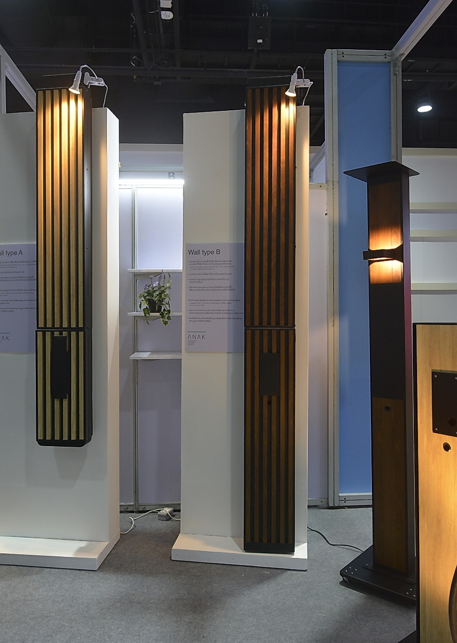 “การดีไซน์เน้นให้ดูมีสไตล์ ผู้ซื้อสามารถเลือกแบบให้เข้ากับตัวบ้าน มีหลายๆ บ้านที่ไม่ได้ติดเครื่องชาร์จกับเสา บางครั้งติดที่ผนัง ก็เลยดีไซน์สำหรับติดผนังมาด้วย มีทั้งขาลอย และแบบตั้งจากพื้นถึงฝ้า แบบขาลอยจะทำให้การใช้งานในพื้นที่ยืดหยุ่นได้ ส่วนแบบตั้งจากพื้นถึงฝ้าทำให้พื้นที่ดูเรียบร้อยมากขึ้น ดูเหมือนตั้งใจออกแบบมาพร้อมบ้านตั้งแต่แรก ข้างบนจะเห็นเป็นกล่อง อันนั้นยืดหดได้ ซ่อนสายไฟ ซ่อนเต้าไฟได้ เหมาะกับบ้านที่มีฝ้าสูง 2.8-3.10 เมตร ถ้าความสูงต่างออกไปก็สั่งทำได้” นัฐพลอธิบายถึงตัวผลิตภัณฑ์