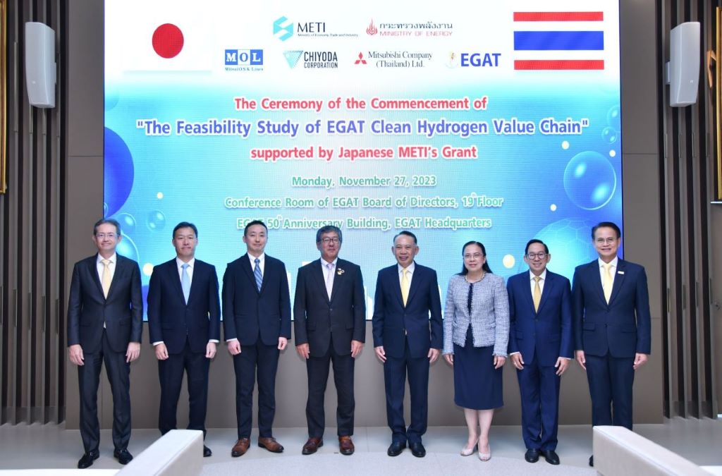 นายนะชิดะ คะสุยะ เอกอัครราชทูตญี่ปุ่นประจำประเทศไทย ดร.ประเสริฐ สินสุขประเสริฐ ปลัดกระทรวงพลังงาน พร้อมด้วยนายวัฒนพงษ์ คุโรวาท ผู้อำนวยการสำนักงานนโยบายและแผนพลังงาน ดร.จิราพร ศิริคำ รองผู้ว่าการธุรกิจเกี่ยวเนื่อง รักษาการผู้ว่าการการไฟฟ้าฝ่ายผลิตแห่งประเทศไทย (กฟผ.) นายยาสุฮิโระ อิโนอุเอะ ผู้จัดการทั่วไป ฝ่ายธุรกิจไฮโดรเจน บริษัท ชิโยดะ คอร์ปอเรชั่น (CYD) นายเรียวสุเกะ สุกิโมโต้ ผู้แทนใหญ่ประจำประเทศไทยบริษัท มิตซุย โอ.เอส.เค ไลน์ จำกัด (MOL) และนายฮิโรยาสุ ซาโต้ ประธานบริษัท มิตซูบิชิ (ประเทศไทย) จำกัด (MCT) ร่วมพิธีเริ่มต้นศึกษาความเป็นไปได้ของห่วงโซ่คุณค่าไฮโดรเจนสะอาดของ กฟผ. เมื่อวันที่ 27 พฤศจิกายน 2566