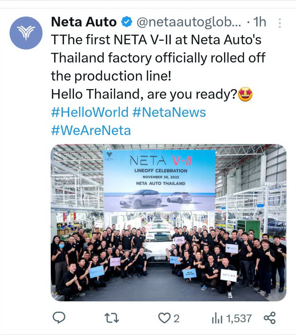 วันนี้ (30 พ.ย. 2566) NETA AUTO ก็โพสต์ลงสื่อโซเชี่ยลมีเดียอย่าง X ว่า