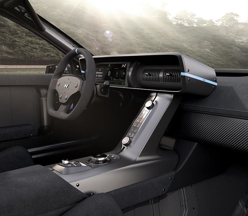 ห้องโดยสารของ N Vision 74 สืบทอดห้องโดยสารสไตล์ห้องนักบินทรงลูกสูบที่มีคนขับเป็นศูนย์กลางของ Hyundai Pony Coupe ผสมผสานองค์ประกอบดั้งเดิมกับการออกแบบที่ทันสมัย เบาะนั่งสไตล์มอเตอร์สปอร์ตที่ใช้งานได้จริง เพิ่มรายละเอียดด้วย Performance Blue เพื่อสร้างความรู้สึกภายในห้องโดยสารแบบเป็นเอกลักษณ์เฉพาะตัวของ N