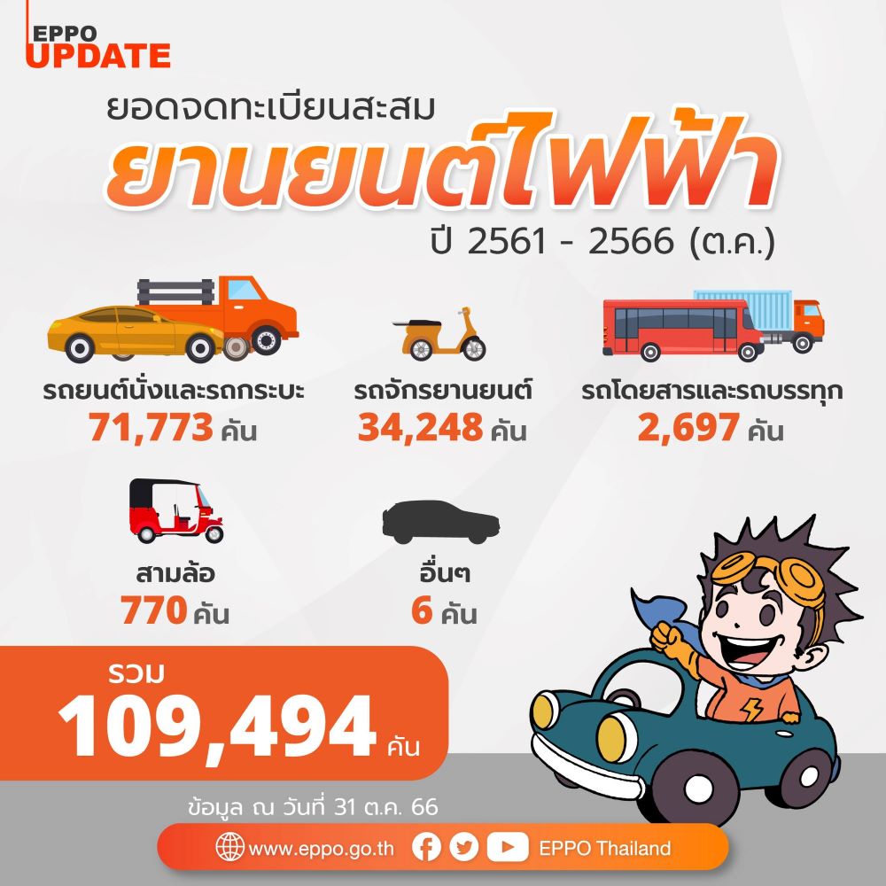 เพจ EPPO Thailand ของสำนักนโยบายและแผนพลังงาน กระทรวงพลังงาน รวบรวมยอดจดทะเบียนสะสมยานยนต์ไฟฟ้าของประเทศไทย ระหว่าง พ.ศ. 2561-2566 และตัวเลขเป้าหมาย 30@30 ปี 2030 มาให้ดูกัน