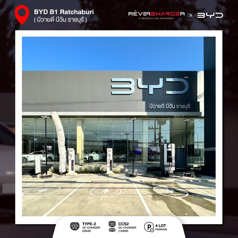 REVERSHARGER ขยายสถานีชาร์จ EV ตามโชว์รูม BYD ต่อเนื่อง สาขาล่าสุดคือ BYD บีวัน ราชบุรี ติดตั้ง DC CHARGE 1 เครื่อง และ AC CHARGE 2 เครื่อง เปิดบริการ 24 ชม. ค่าชาร์จ 8 บาท/กิโลวัตต์
