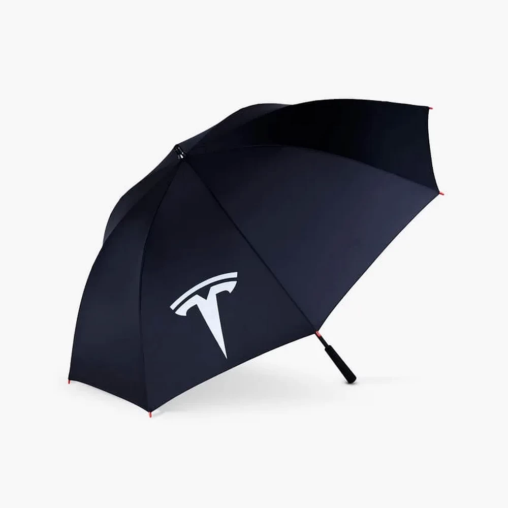 ร่มพิมพ์ลายเหมาะสำหรับกิจกรรมกลางแจ้งทุกชนิด มีโลโก้ที่โดดเด่นที่ด้านนอกพร้อมตัวอักษร Tesla ที่ด้านล่าง บนปลอกเก็บของและขึ้นรูปเข้ากับที่จับโดยตรง ปลอกยางสีดำพร้อมปลายพลาสติกสีแดง