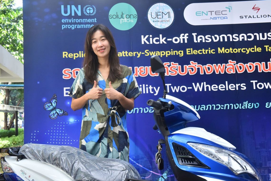 Ms. Yeonju Jeong ผู้แทนกองทุน SOLUTIONSPlus กล่าวว่า โครงการนี้ได้ตั้งเป้าสนับสนุนราคารถจักรยานยนต์ไฟฟ้าเพิ่มเติมจากการสนับสนุนของภาครัฐ มีเป้าหมายรถจักรยานยนต์ไฟฟ้ารับจ้างจำนวน 30 คัน จะเป็นการนำร่องใช้รถจักรยานยนต์ไฟฟ้าในใจกลางย่านเศรษฐกิจของกรุงเทพมหานคร ซึ่งตรงกับเป้าหมายของหน่วยงาน Urban Electric Mobility Initiative (UEMI) ที่ต้องการสนับสนุนการเปลี่ยนผ่านสู่เทคโนโลยียานยนต์ไฟฟ้า โดยเฉพาะในเขตเมืองที่มีมลพิษทางอากาศหนาแน่น รวมทั้งมลภาวะทางเสียง โดยส่งเสริมให้คนเมืองหันมาใช้ระบบขนส่งมวลชนที่มีประสิทธิภาพดีกว่า ด้วยตัวเลือกการเดินทาง First mile และ Last mile เพื่อให้พลเมืองมีระดับคุณภาพชีวิตดีขึ้น