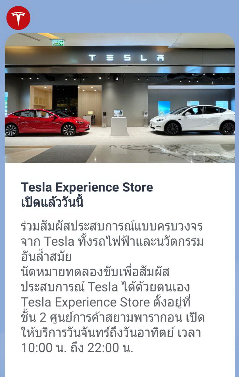 TESLA EXPERIENCE STORE เปิดแล้ว พิกัด ชั้น 2 ศูนย์การค้าสยามพารากอน มีรถครบทุกโมเดลมาโชว์ พร้อมนวัตกรรม EV ล้ำสมัย ให้บริการ วันจันทร์-วันอาทิตย์ เวลา 10.00 – 22.00 น.