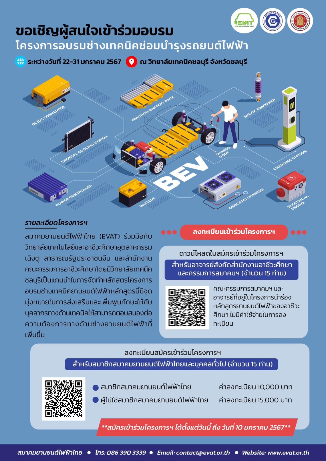 EVAT ร่วมมือกับเทคโนฯเฉิงตูและเทคนิคชลบุรีเปิดคอร์สพิเศษหลักสูตรซ่อมบำรุงรถยนต์ไฟฟ้า ที่วิทยาลัยเทคนิคชลบุรี จังหวัดชลบุรี ระหว่าง 22-31 มกราคม 2567 เปิดรับสมัครถึงวันที่ 10 มกราคม 2567